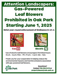If you witness someone using a gas-powered leaf blower, please email propertyissues@oak-park.us and provide the address where it was being used. The Neighborhood Services Department’s Code Compliance Division will then follow up with the property owner to ensure future compliance.