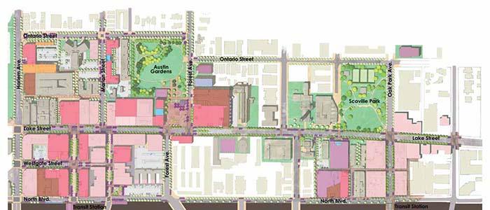 The Village of Oak Park works to maintain the character of the community by managing change through the Comprehensive Plan and business district plan recommendations. The Village also regulates development of private property through the Zoning Ordinance and Sign Code.