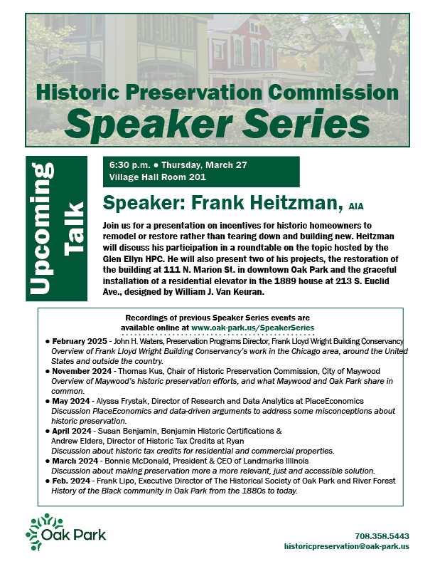 Presentation titled “Neighbors in Preservation” featuring an overview of Maywood’s historic preservation efforts, and what Maywood and Oak Park share in common. Highlights of Maywood’s successes, challenges and how to make historic preservation work for both communities will be discussed.