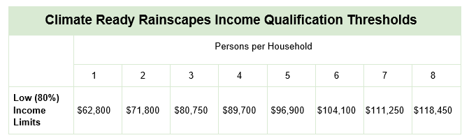 For the purposes of the Climate Ready Rainscapes program, homeowners are classified as “income-qualified” if their annual household income is equal to or less than 80% of area median income (AMI) at the household level. To determine if you are an income-qualified homeowner, check the table below. Find the income amount listed below the number of persons in your household. If your household income is equal to or less than this amount, you are an income-qualified homeowner and are eligible for additional assistance in soliciting a bid and selecting a contractor for your project, and the Village will reimburse the contractor directly for its share of the cost.
